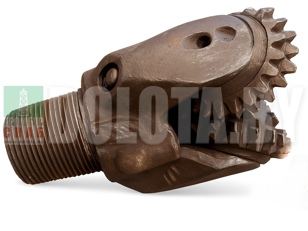 Долото оснащено твердосплавными зубками на обратном конусе шарошек, которые выполняют функцию калибровки скважины и предотвращают преждевременный износ корпуса. Дополнительную защиту обеспечивают козырек и ребро набегающей грани спинки лапы, армированные твердосплавными зубками и наплавленные твердым сплавом.